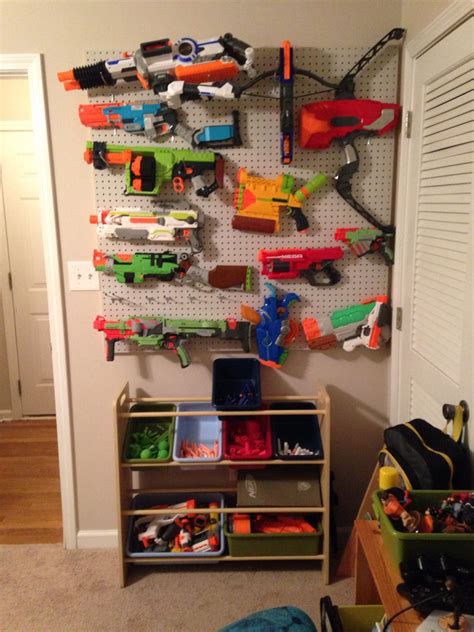 Pin on DIY from i.pinimg.com And if i wasn't on a budget i definitely would've bought some of that cool stainless steel or blue pegboard! An easy diy solution for organizing and storing nerf guns and accessories. Nerf gun storage nerf gun holster nerf gun wall nerf gun rack nerf guns nerf gun bundle nerf gun wall holder peg board nerf gun vest nerf gun sniper. This is my very first instructable. He loves his nerf guns. No more nerf darts and guns lying everywhere. Nerf gun wall rack ✅. Of course, prices will vary slightly by area (we're in minnesota) and quantity/style of hooks chosen too.